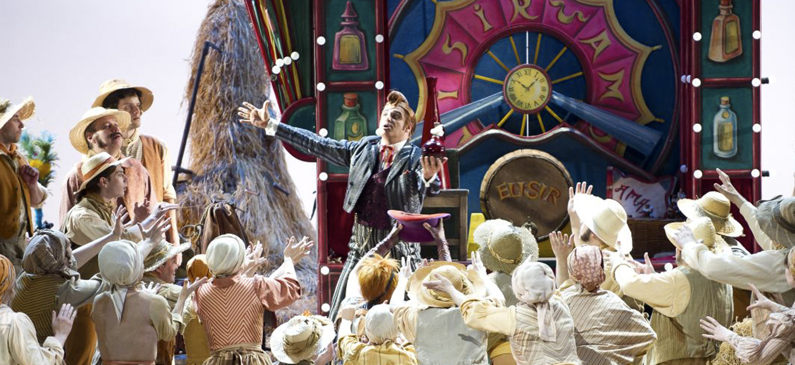 Либреттист Феличе Романи воспользовался беспроигрышным вариантом: в основу его произведения легло французское либретто Эжена Скриба для одноименной оперы Даниэля Обера 1831 года. Это веселая итальянская история о богатой крестьянке Адине, которая кружит голову простодушному воздыхателю Неморино, используя для этого заезжего сержанта. Бродячий лекарь-шарлатан Дулькамара продает влюбленному «любовный напиток», который, тем не менее, позволяет разрешить все проблемы. Несмотря на спешку композитора, опера получилась на славу: занимательный сюжет и легкая мелодика обеспечили произведению долгую зрительскую любовь. Изящность, легкость, кажущаяся простота этой оперы и привлекли к ней внимание Михайловского театра.